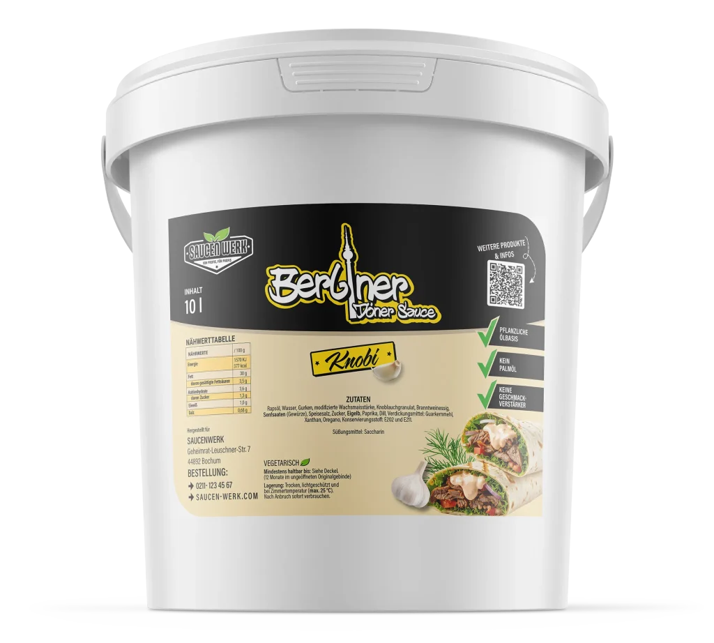 Unsere Berliner Döner Sauce Knobi bringt den authentischen Geschmack der Hauptstadt direkt in deinen Imbiss oder auf den Teller. Cremig, würzig und mit einer fein abgestimmten Knoblauchnote, perfekt zu Döner, Falafel, Wraps, Grillfleisch oder Pommes.